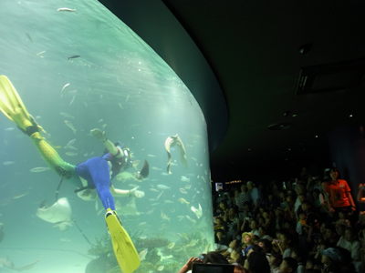湾曲した大きな水槽は新しく作ったもののようです。ダイバーのお姉さんが、鋭い歯を持つ肉食魚のウツボを引っ張りだして泳がせていたので驚きました。水槽の右上ににょろっとなっているのがウツボです。