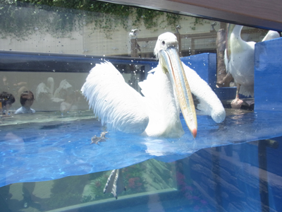 ペリカンもいました。白くて綺麗な、思ったより大きく迫力のある鳥でした。この日は練習中とのことでまだでしたが、餌やりショーもやってます。水中で口を開けてザバーッと魚をすくうそうです。