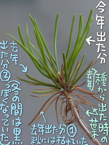 写真はうちの黒松の今日の様子です。昨年の春に種から芽を出したもので、発芽から1年4ヶ月ほど経ったところです。去年出た葉よりも、今年出た葉の方が長くなっています。樹が少し太くなったからなのか、他の理由かはわかりません。