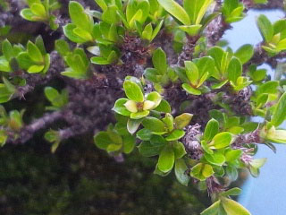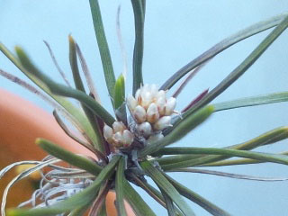 冬の間真っ黒くなっていた葉が緑色に戻ってきて、新しい芽がふくらんできています。白い袋みたいのが破れて中から2枚ずつ葉が出てくるのではないかと思います。左下にもうひとかたまりあるので、どうやらここから枝分かれする気らしいです。