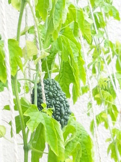 手前の大きい実は、ゴーヤチャンプルーにしようと思います。向こうに見えている小さい実が、今長さ3cmぐらいです。今年初めてゴーヤを育てたので、1〜3個目の実は最後まで見届けて種を採り(←どうなるか見てみたかったのと、可愛らしすぎてどうしても収穫できなかったので)4個目は、完熟で取って切って食べてみました。今なっているのが5個目と6個目です。