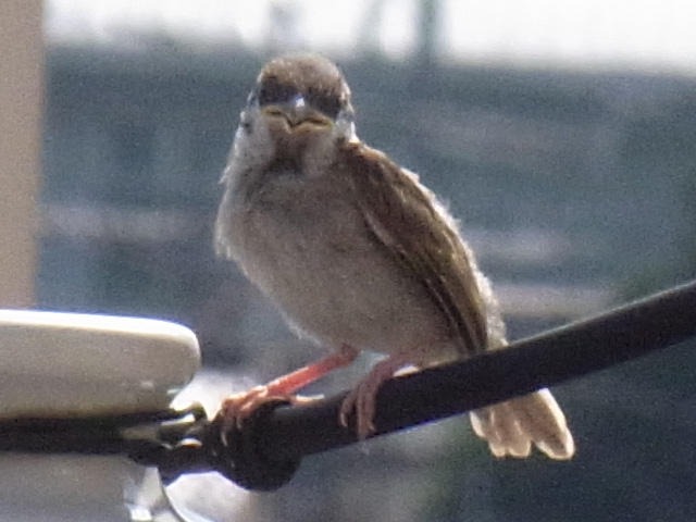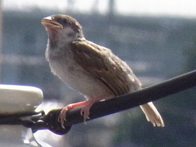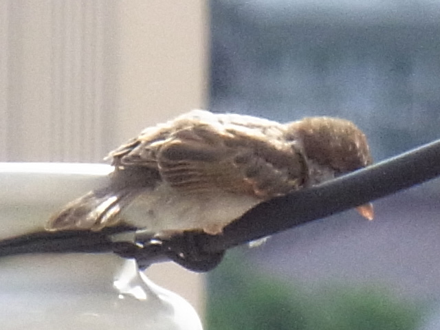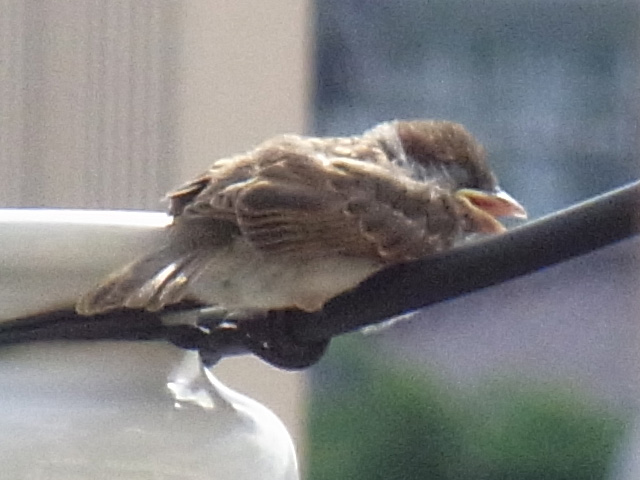 あと、少し前、7月2日の写真なのですが、うちのベランダの目の前にある電柱に来ていた子スズメです。