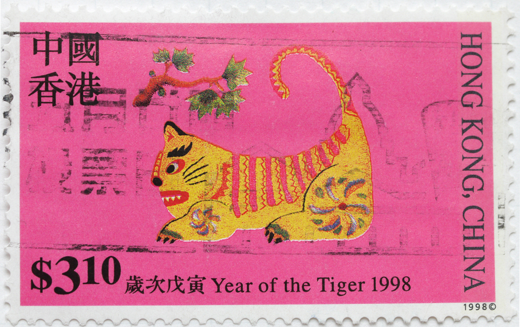 このページの上に貼ったピンクの虎の絵は、上の虎切手ページの中にあった香港の年賀切手です。可愛い!