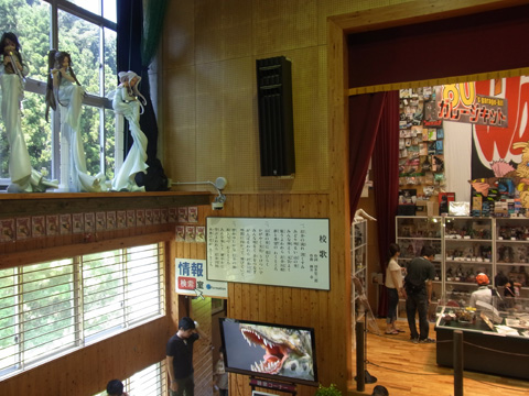 この建物が小学校の体育館だった頃の、校歌がそのまま残されています。シュールといえばシュールな光景ですが、現地で見ると不思議にしっくり馴染んでいます。尋常じゃない量の精魂込めたフィギュアが醸す遊び!のパワーと、かつて本当に小学校として使われていた場所の空気がマッチしていると感じました。本当は、ぜひ現地に足を運んで見ていただきたいです。