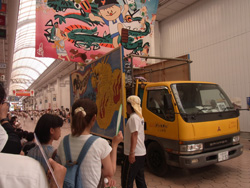 各チームの先頭に上のような地方車(じかたしゃ)がいて音楽を鳴らしたり上に人が乗ってマイクで煽ったりします。デザインはいろいろです。商店街の中もどんどん通ります。この車は、愛媛の新居浜のチームのものです。