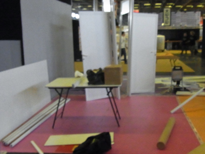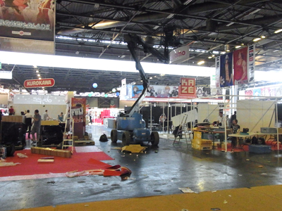 こちらは前日の様子。左に見えているのが私のブースです。広い会場内を工事車両が走り回っていました。