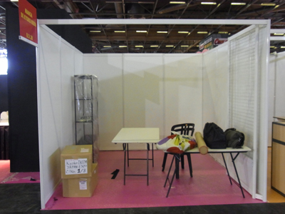 会期が4日間ありましたので、夜間は、中をそれなりに片づけてこのように覆いをして帰りました。