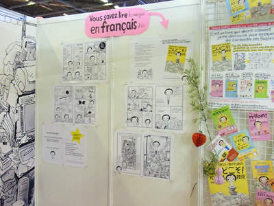 右奥には、現地の方に読んでいただけるように、拙著『片づけられない女のための こんどこそ!片づける技術』のはじめの方のフランス語訳を掲示しました。知人のフランス人の方にお願いして訳していただいたものです。