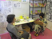 「初音ミク」を紹介した回の絵に、「あっミクだ〜」という感じで反応する若い女の子が多かったです。なかには小学生ぐらいの子もいました。その下に「けいおん!!」を紹介した回のコピーも貼っていたのですが、ミクの後にけいおんに気づいて、「あっ、けいおんも〜♪」みたいに見てました。一人の子に、けいおんのどの子が好きかきいてみたら「mio」って言ってました。