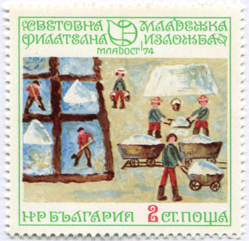 下の2枚もブルガリアの切手です。大勢で何かを運んでいるところと、金髪碧眼の女医さん。