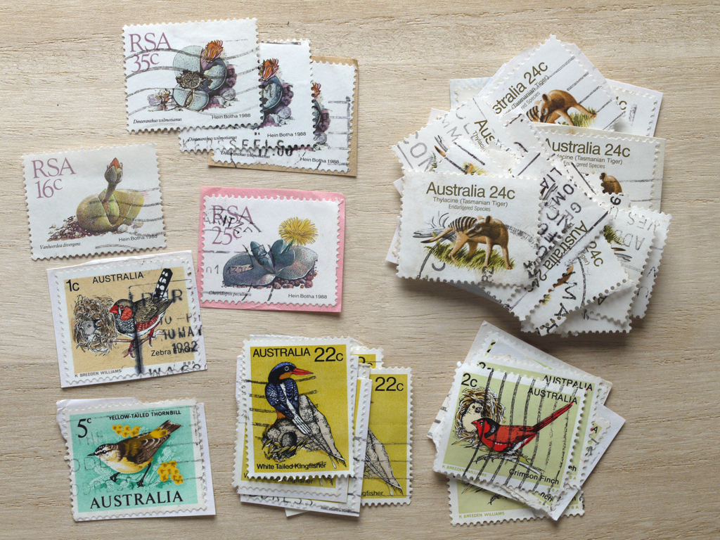 デパートのおもちゃ売り場の切手・コインのコーナーで買った、「紙付 外国未整理切手」という袋の中に入っていたオーストラリアの切手の一部です。この袋をたまたま買ったのがきっかけで、切手をちょこちょこ集め始めました。