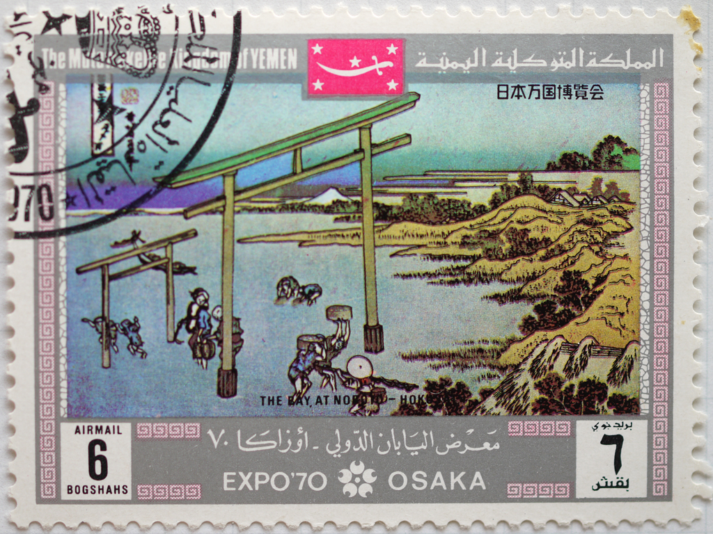 ↑イエメンの切手。HOKU…という字が見えるので、北斎の絵かもしれません…?
